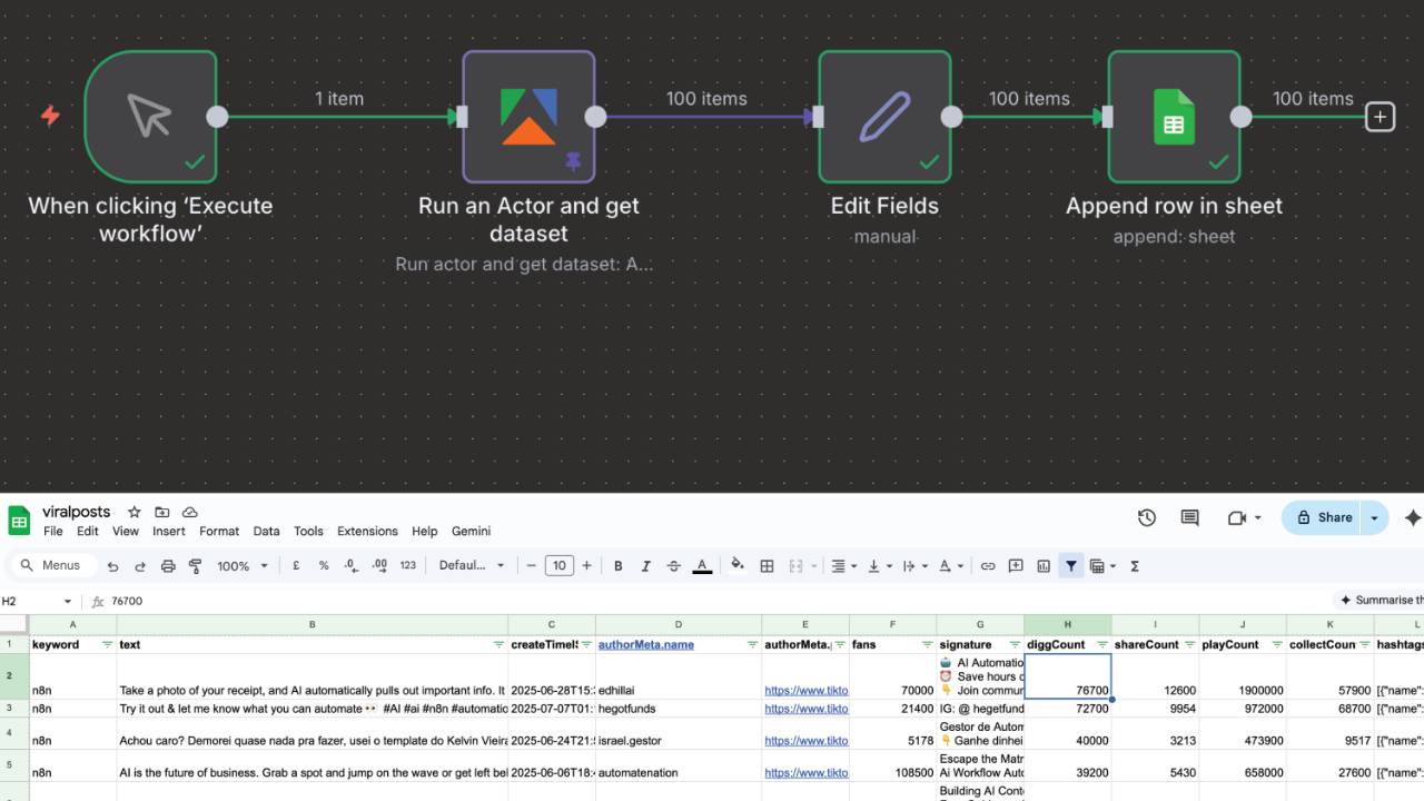 Stop guessing what goes viral on TikTok. This automation pulls data from top-performing posts in your niche and organizes it in Google Sheets, so you can spot patterns, analyze engagement, and model proven content formats using real performance data, not intuition.